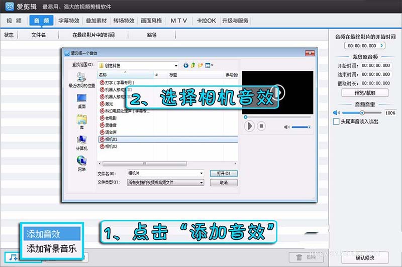 1、在“音频”面板,点击列表左下角“添加音频”—“添加音效”,在弹出列表中选择相机的音效,插入到闪光开始的时间就可以啦~