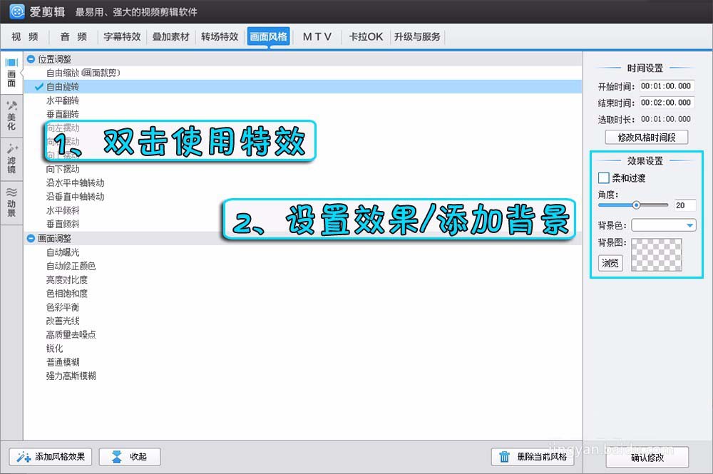 1、在“画面风格”—“画面”列表,选择“自由缩放”、“自由旋转”等,都可以做到这样的效果。