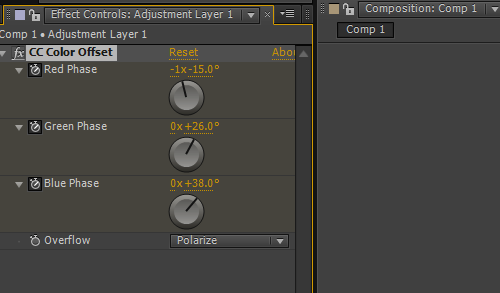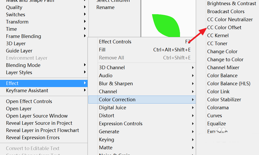 3、右击调整层,找到【effects】-【color correction】-【cc color offset】