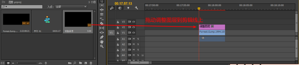 1、首先我们需要新建一个调整图层,将调整图层拖动到剪辑轴上