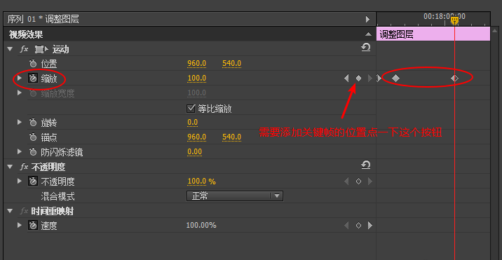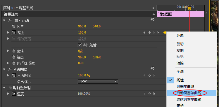 3、选中调整图层,然后在效果控件里面,在缩放效果取合适的位置打两个关键帧,然后选中这两个关键帧,右键选择自动贝塞尔曲线,这样会使放大的过程看起来更流畅一点