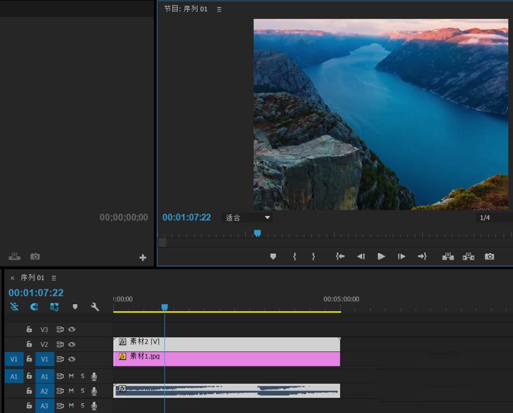 4、将素材1.jpg拖动到视频1轨道,将素材2.mp4拖动到视频2轨道,调整图片素材的长度,使之于视频时间相等;
