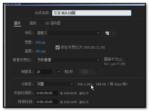 1、CTRL+N新建合成,在弹出的设置面板中,设置好名称,宽度、高度,再设置好动画的时间。本例中是10秒时间。然后点确定。