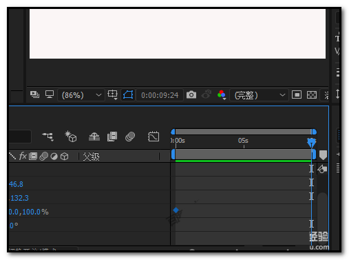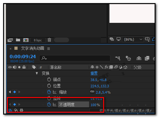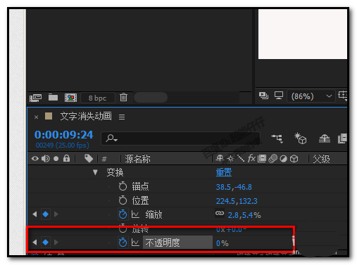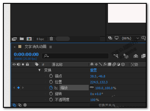 4、“变换”下方弹出五项的设置;我们要做缩放动画,和消失动画。那么,我们把时间指示器这里移动最左侧(本步骤第一张图);我们再点下“缩放”左侧的小圈圈,选中它(本步骤第二张图)。