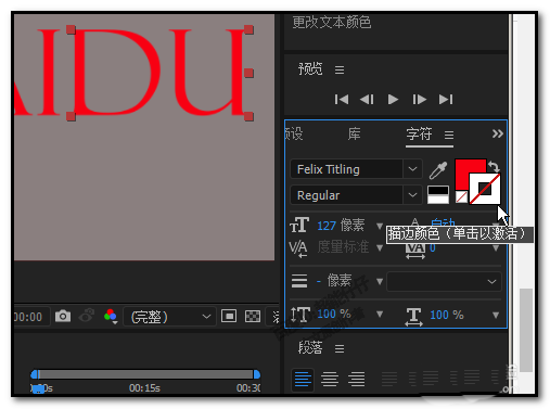 1、上述例子中,文字是没有描边的,假设,现在要给文字添加一个黑色的描边。同样要在文字属性面板这里操作,在描边色块这里,我们看到,现在描边色块中间是有一条红色斜杠;表示此时是没有设置描边颜色。鼠标点下描边色块,使色块在当前位置(在填充色块的上方)