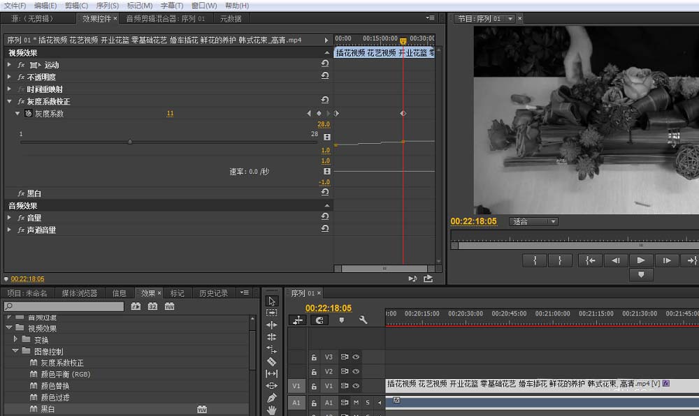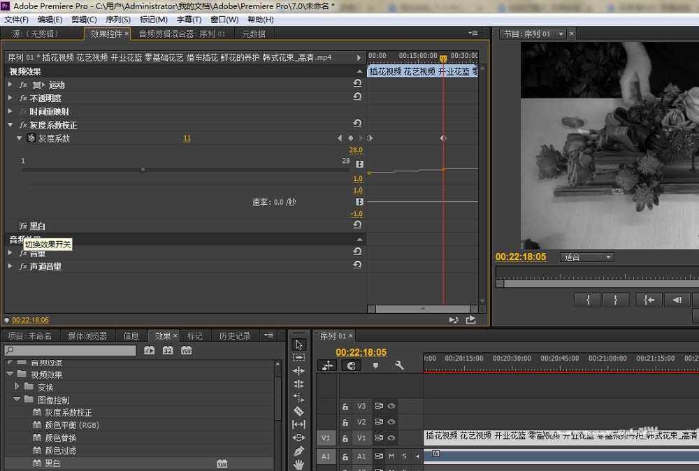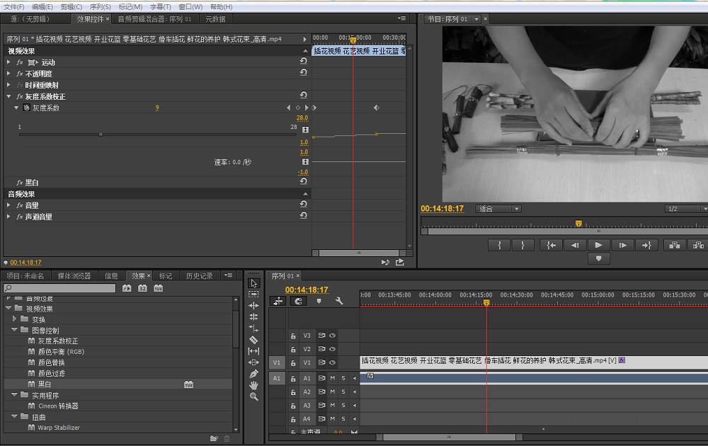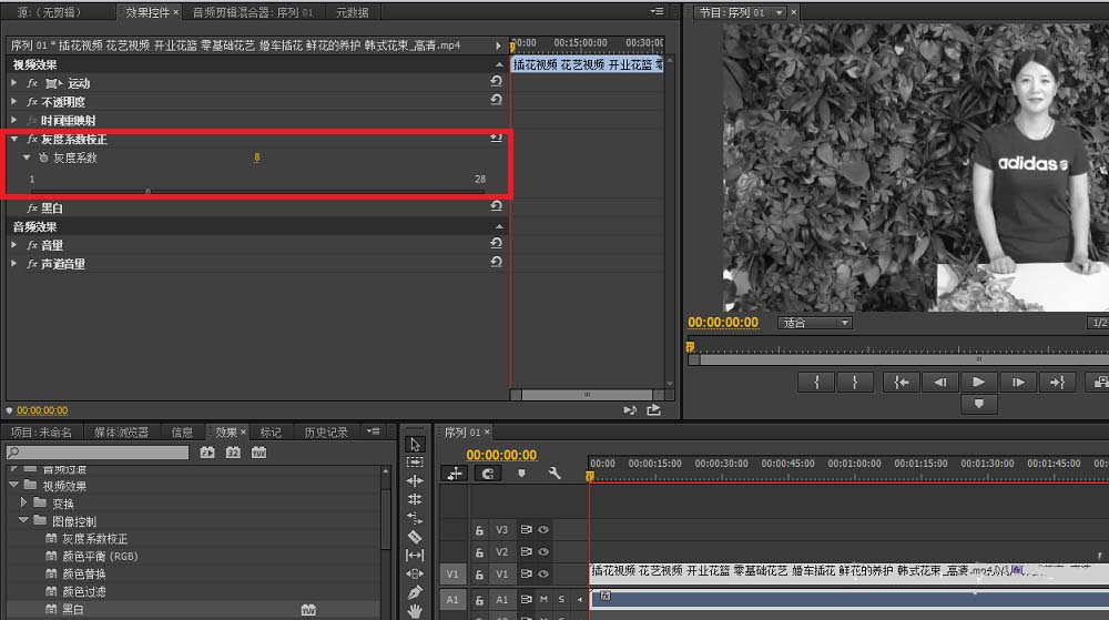 3、激活效果面板,找到视频效果:黑白,灰度系数校正。