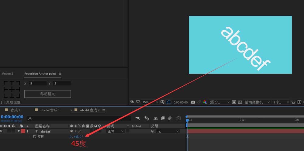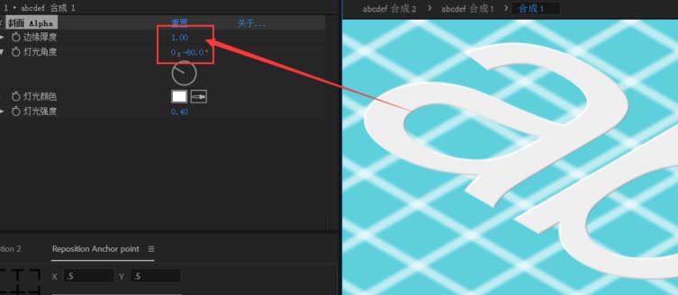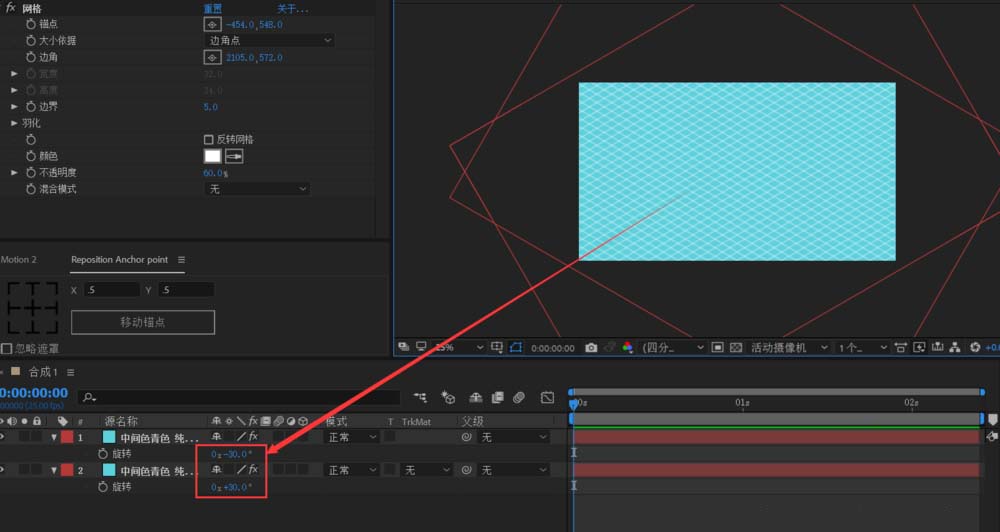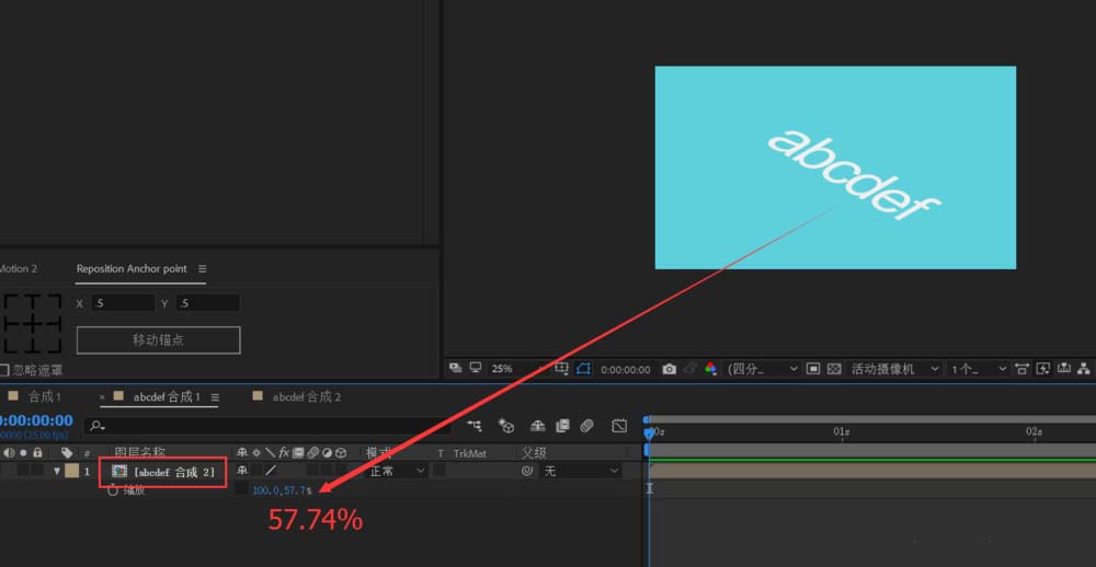 7、回到上一个合成调出缩放属性设置Y轴值为57.74%即可(这里的45和57.74为固定值,可根据数学原理计算得来)