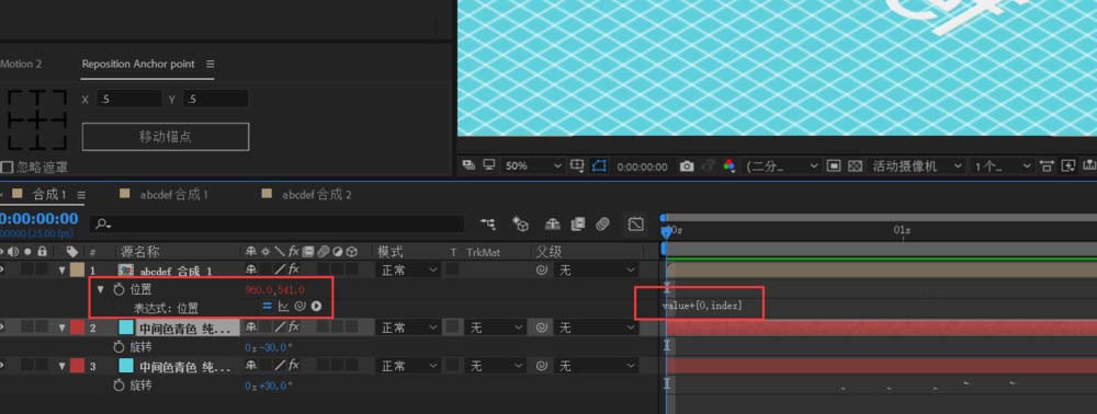 11、P键调出原始合成的位置,按alt键并点击秒表为该属性添加表达式value+[0,index]