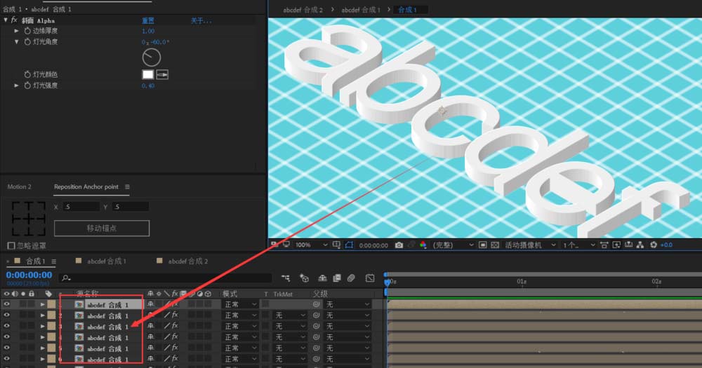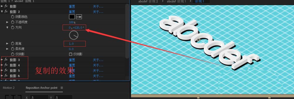13、将底层合成添加投影效果,设置距离为1后ctrl+D不断复制该效果直到预期效果