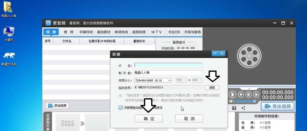 1、启动爱剪辑软件,首先会设置一下临时文件夹,为的是将一些素材临时保存在此。此时看一下路径,通常是硬盘靠后的分区(磁盘空闲)。