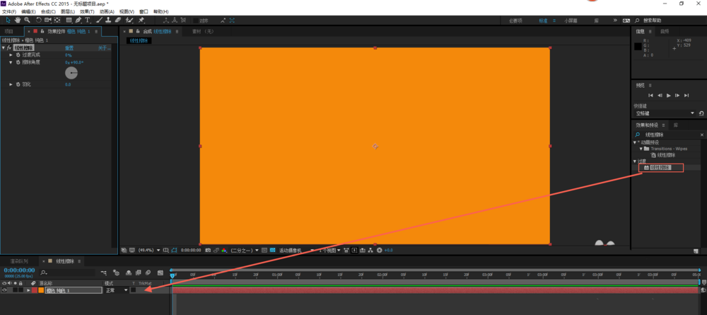 2、新建纯色图层(快捷键:CTRL+Y),将【效果和预设】面板中的“线性擦除”特效拖动到时间线上;
