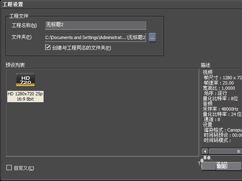 1、首先启动edius6,新建一工程,采用默认参数,点击确定按钮进入主界面。