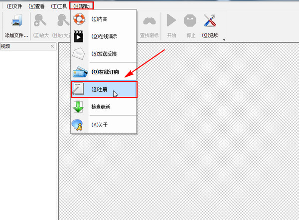 因为这款软件现在是没有进行注册的,所以我们现在要将软件进行一个注册操作,注册与不注册的区别就在于不注册的时候只能保存时间为一分钟的视频,注册之后则没有时间限制。点击“帮助”菜单下面的“注册”按钮。