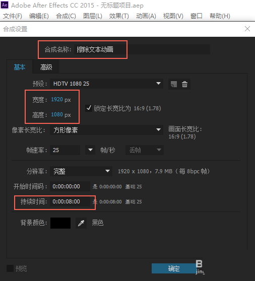 1、打开AE新建项目并新建合成,设置合成的名称为"擦除文本动画",合成的大小为1920*1080,合成持续时间为8秒钟;