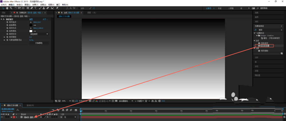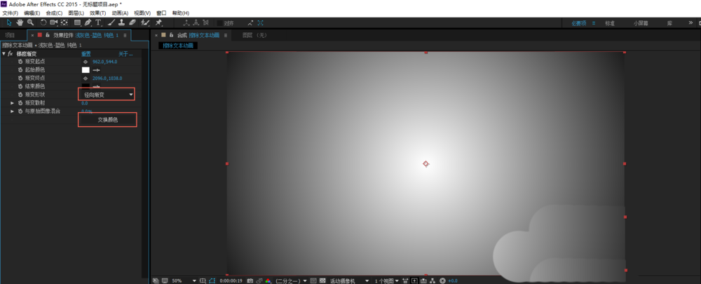 2、CTRL+Y新建纯色图层,在【效果和预设】面板中搜索渐变,将生成特下的梯度渐变拖拽到纯色图层上,调整渐变形状为“径向渐变”,单击“颜色交换”按钮;