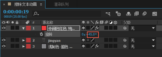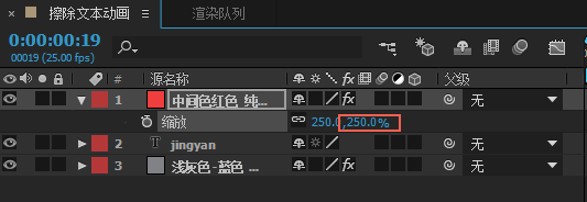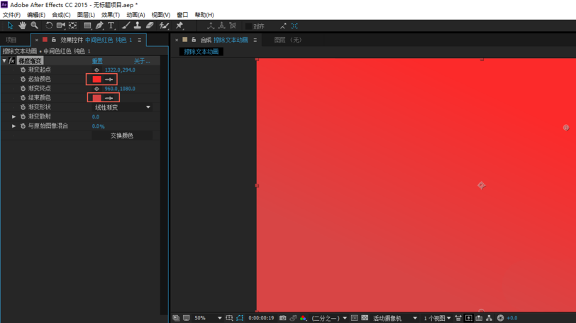5、将生成中的梯度渐变特效拖拽到“中间色纯色”图层,并调整“梯度渐变”的其起始颜色和结束颜色;按S键跳出缩放属性,调整属性值为250%;按R键调出旋转属性,设置旋转的角度为45°;