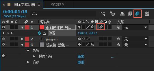 6、单击“中间色纯色”图层,按P键调出位置属性并打上关键帧,设置1秒的时候图层在画面的右上角,开启运动模糊并开启运动模糊总开关;