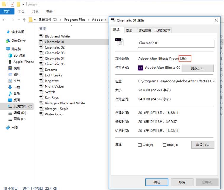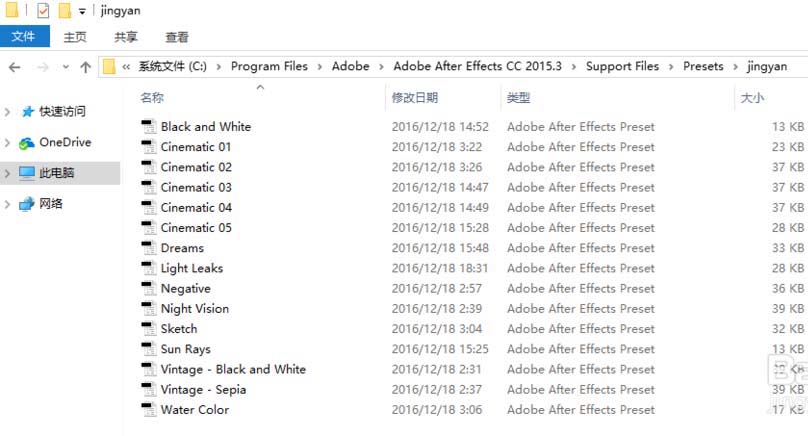 2、打开AE的安装目录,C:\Program Files\Adobe\Adobe After Effects CC 2015.3\Support Files\Presets 找到Presets文件夹,新建一个文件夹,将需要导入的FFX预设文件放里面