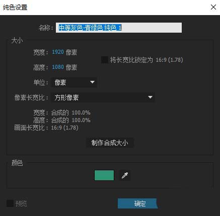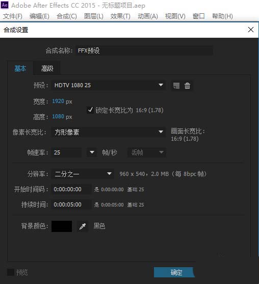 3、打开AE,新建项目并新建合成,设置合成的名称为FFX预设,画面大小为1920*1080,持续时间为5秒钟;CTRL+Y新建一个纯色图层;