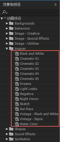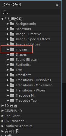 4、在【效果和预设】面板中下的“动画预设”中找到步骤二中建立的文件夹,本文中是jingyan文件夹,单击jingyan文件夹前的小箭头,即可看到我们导入的ffx预设文件;