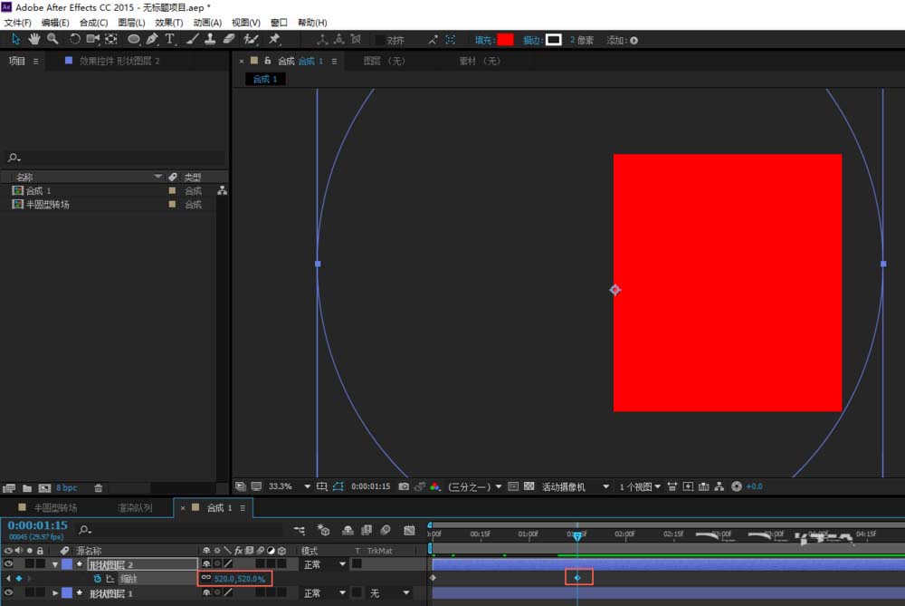 3、按S键调出图层的缩放属性,设置0秒时为100%,1秒15帧的时候,打上关键帧并调整缩放属性,设置值为520%,使圆形铺满整个画面;框选这两个关键帧按F9键,单击“图表编辑器”,将动画修改成先快后慢的效果;