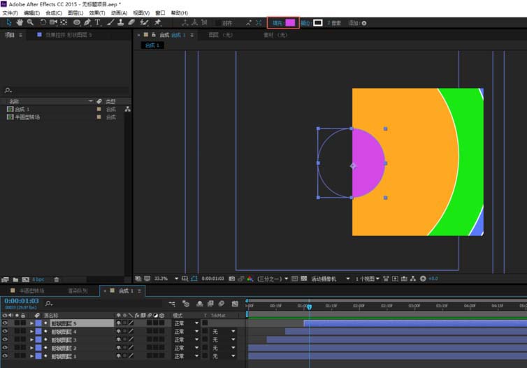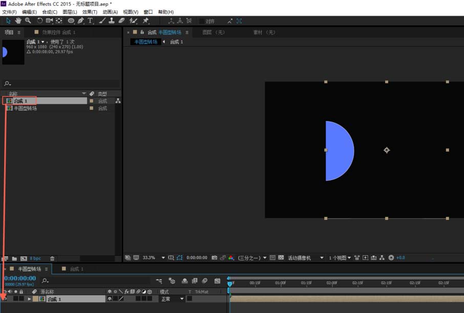 5、双击“半圆型转场”图层,将“合成1”拖动到“半圆型转场”图层,按字母P键调出“位置”属性,移动X轴坐标,将图层和画面的左侧边对齐。