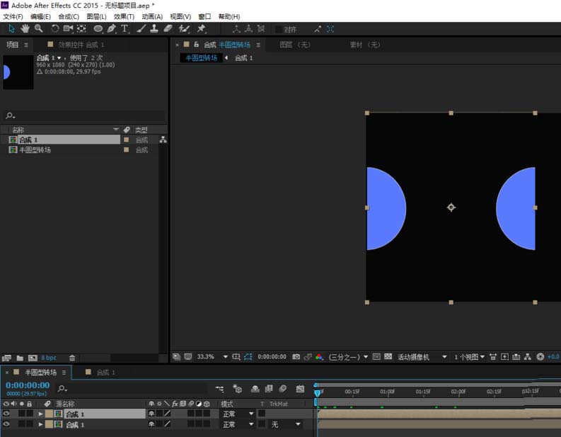 1、打开AE新建一个项目并新建合成,设置合成的名称为半圆型转场、合成的大小为1920*1080,合成的时间为8秒钟;在建立一个合成,设置合成画面的大小为960*1080,持续时间为8秒钟;
