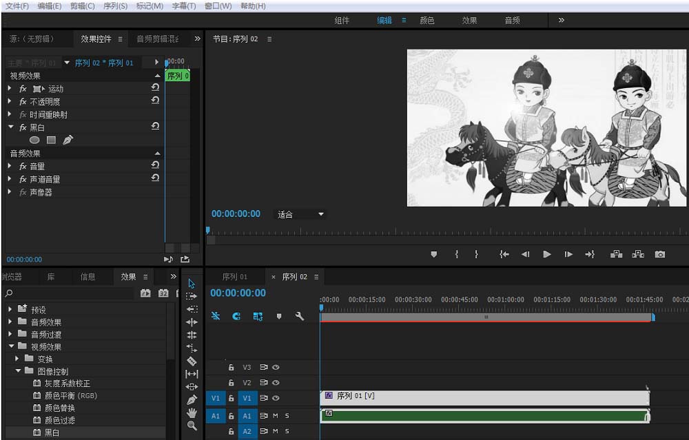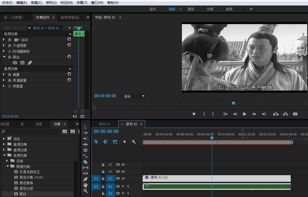 6、将视频效果中的黑白效果添加到序列2中的素材上。