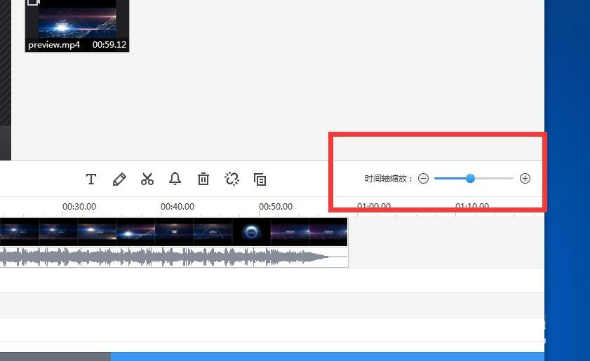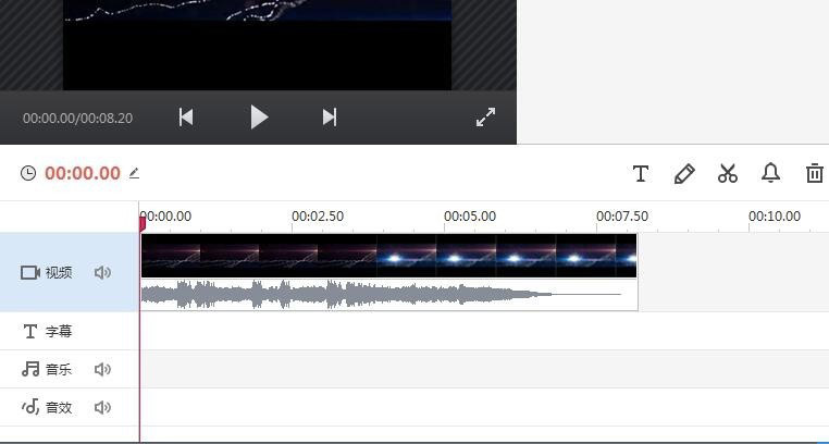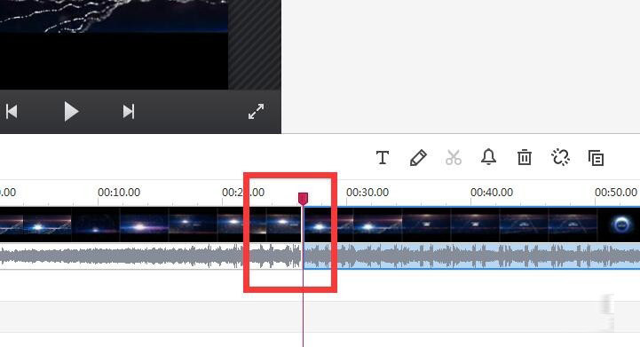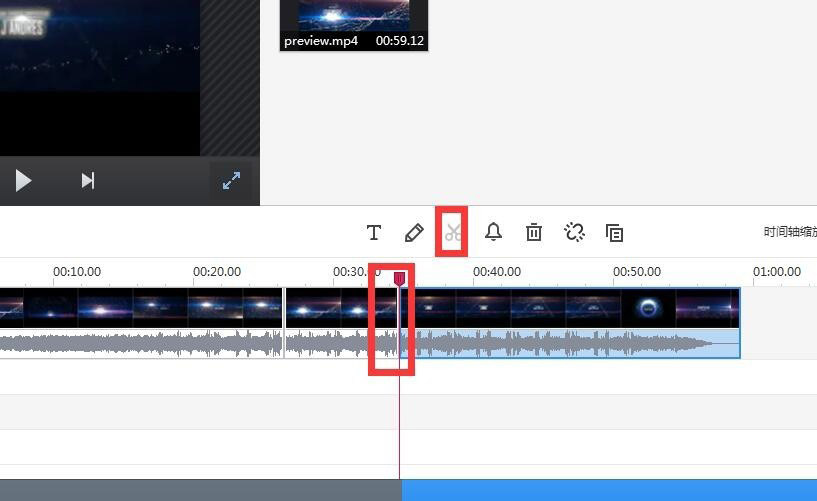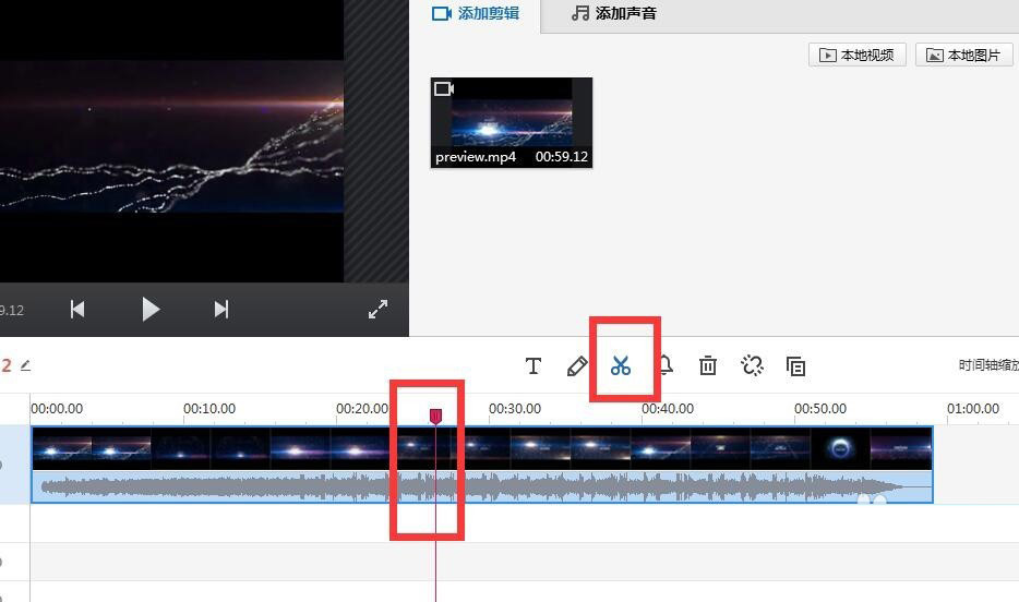 4、将时间线指针拖拽到要剪辑的起点,点击上方的剪刀工具。点击一下即可切断