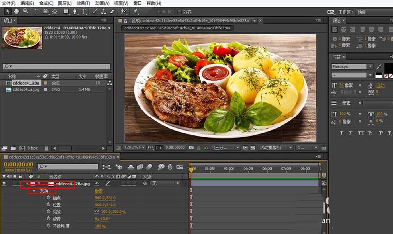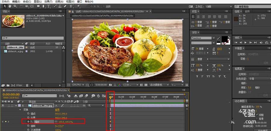 4、将关键点放在开始,激活缩放,保持缩放比例在百分之百