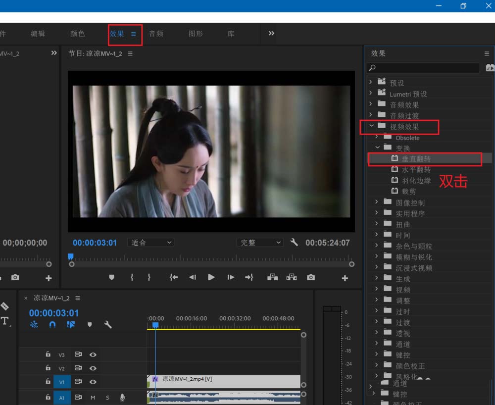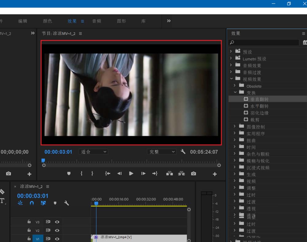 6、选中视频轨道后,单击上方的效果,然后在右侧依次找到视频效果,变换,垂直翻转。进行双击。