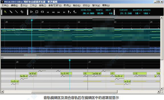 音轨编辑是Vocaloid3特色之一,可以通过WAV倒入音频文件,来进行对轨,可以用来做合 成,扒谱等工作。可以通过复制分轨使用混音器及VST插件制作压限/延时/混响的后期合成效果。