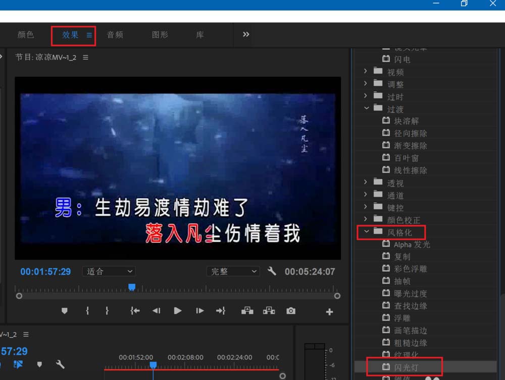 5、选中视频轨道,点击上方的效果,然后在右侧找到视频效果,然后找到风格化下方的闪光灯。