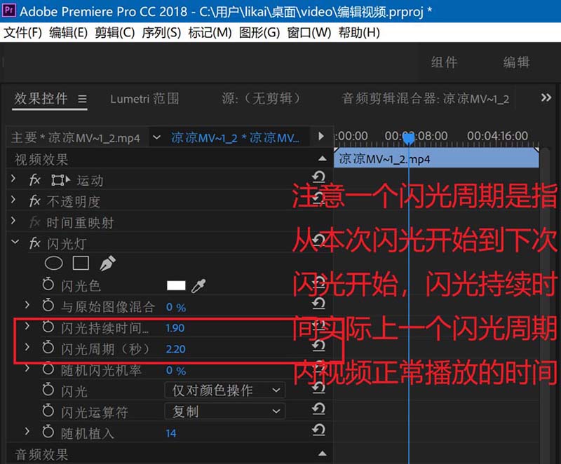 6、在左侧的效果控件,然后调节效果参数,如下图红框所示,请注意图片中的文字描述,这个将严重影响视频闪光效果。