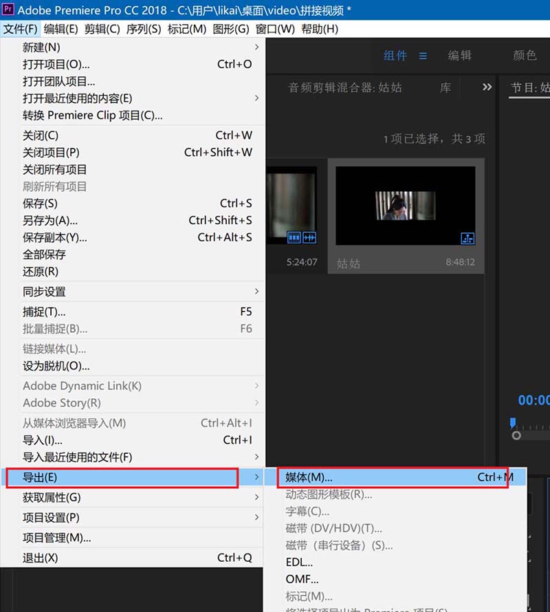 7、修改好的视频可以通过文件,导出,媒体命令来实现文件的另存为。