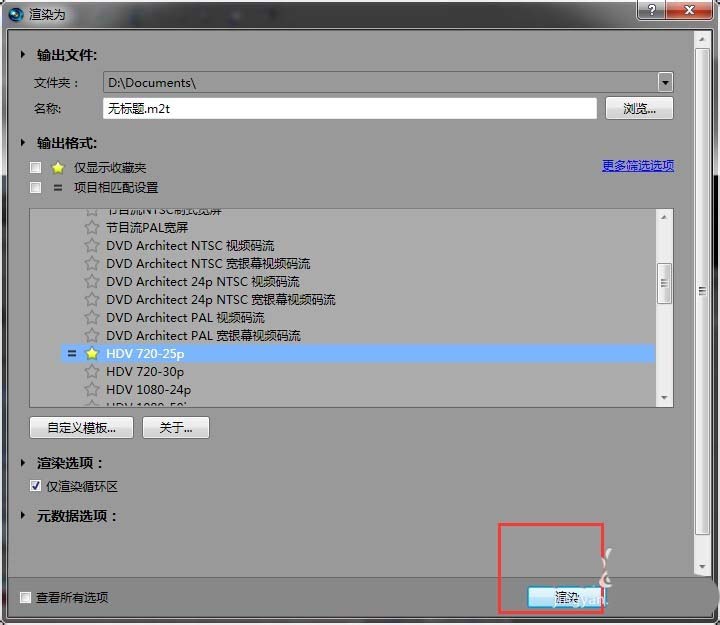 4、在渲染格式的选择上,我们根据视频的属性选择:720P模式的MPG格式。