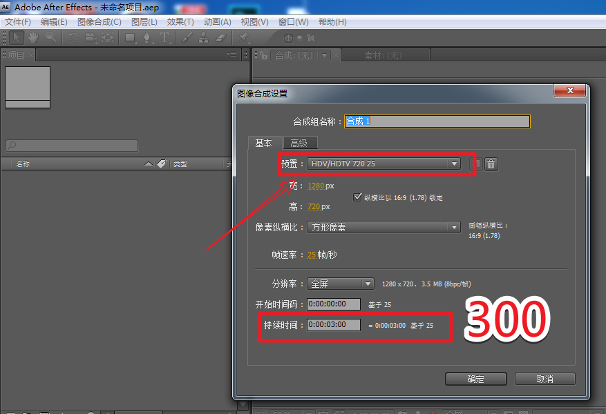 2、将新建合成的预置设为:HDV/HDTV 720,持续时间设为:3秒(输入:300)