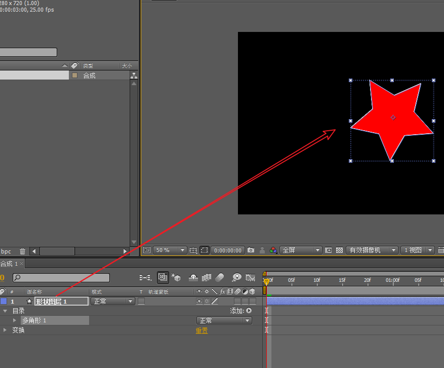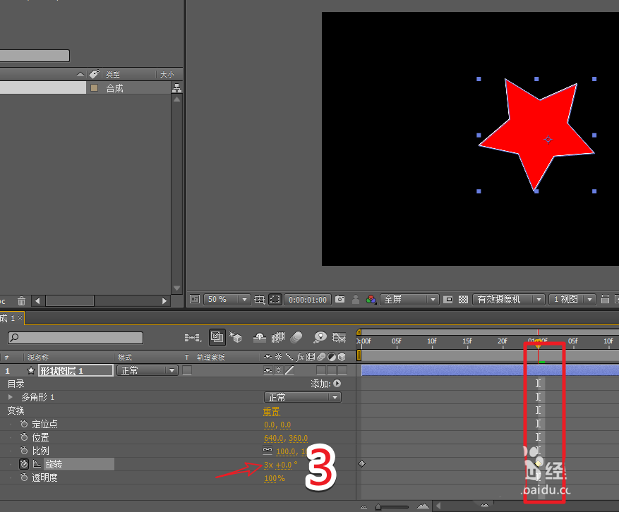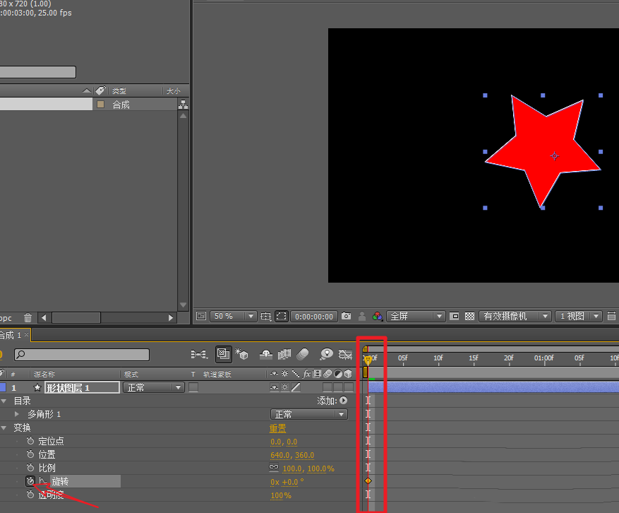1、将时间线播放头移动到第一帧,为形状图层的旋转属性添加关键帧。