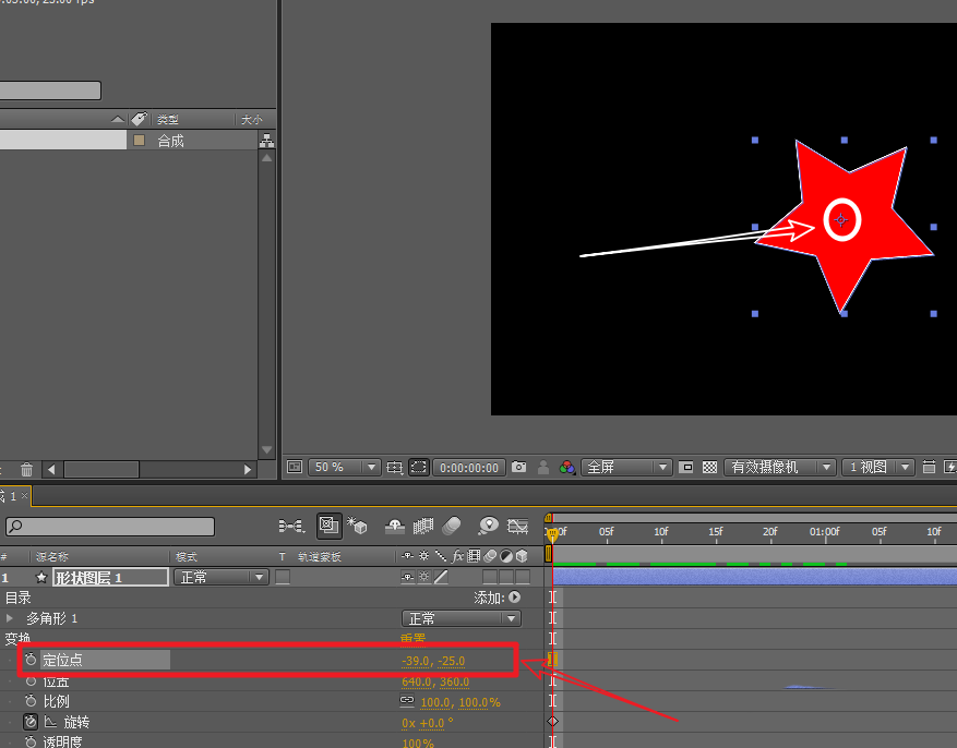 3、我们希望星星的轴心点在星星的中心位置,这样才不会产生奇怪的抖动。调整定位点的属性参数,将其确保移动到星星的中心位置即可。