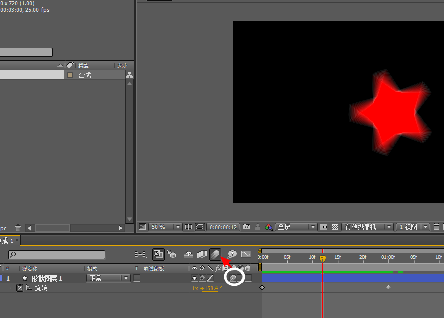 4、最后我们将图层上运动模糊打开,再打开总运动模糊开关,这样星星在转的时候才会产生运动模糊,看起来会真实些。