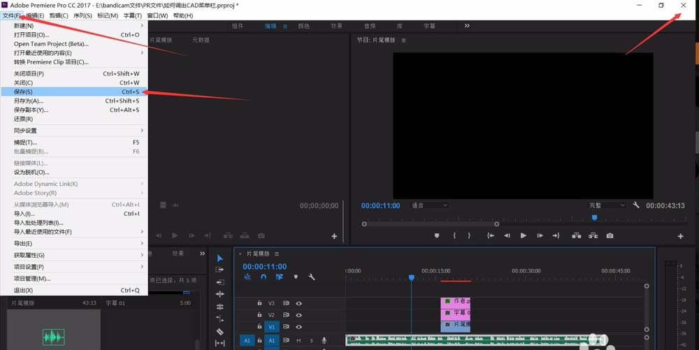 4、完成视频固定不变项目的导入后,我们就可以在菜单栏中点击“文件——保存”,对我们新建的模版项目进行保存。