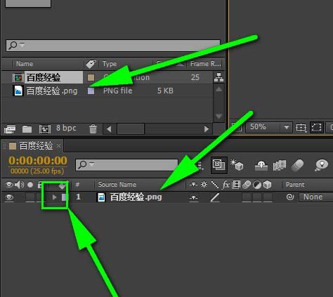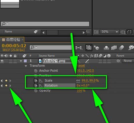 11、如图,在AE时间线面板中即可看到有两处关键帧啦。在关键帧内即可看到画面逐渐旋转放大的特效了。