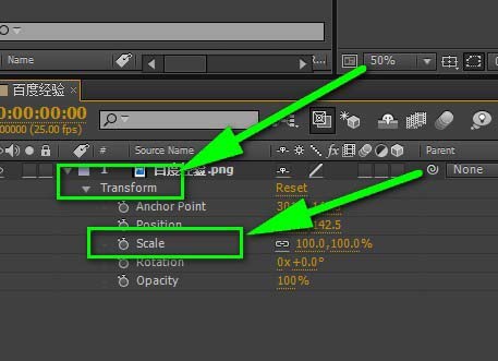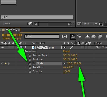 4、点击scale前方的关键帧小图标开始添加关键帧并且设置缩放比例便可。
