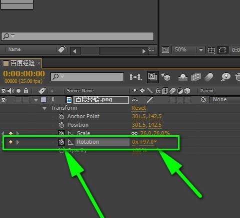 6、同理再把AE的rotation这个旋转特效加上关键帧以及设置旋转角度便可。