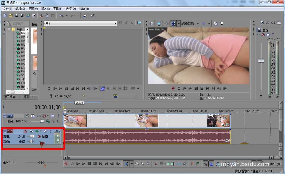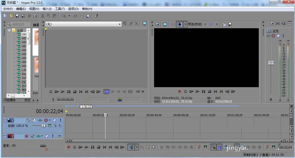 4、 打开视频之后,看到Sony Vegas 软件主页面,有两个轨道,一个是音频,一个是视频图片。
