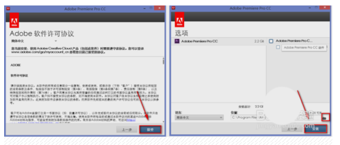 4、然后点击“接受”,然后会让你选择安装路径,不建议安装在系统盘,可以选择安装道其他盘,然后单机选项下方的“Adobe premiere Pro cc”把右边组件的勾去掉,然后单机右下角的“安装”。