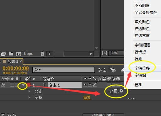 3、点击文字小三角——动画——字符位移;