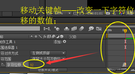 5、移动关键帧——改变一下字符位移的数值;按空格预览效果;