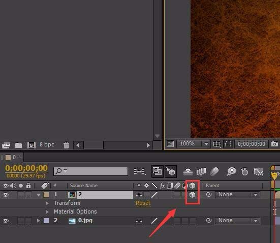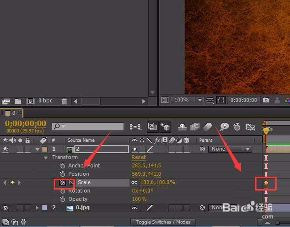 5、转换为3D图层之后。我们选择scale选项,在第一帧处点击码表,创建关键帧,如图所示: