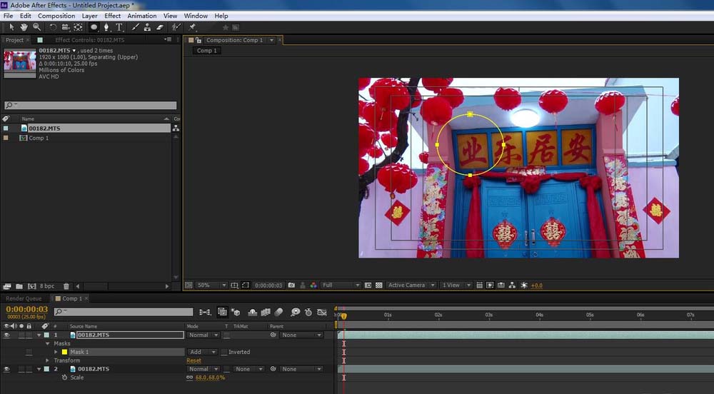 5、打开圆圈遮罩的形状属性,进行关键帧的添加,在开始的地方设定位置